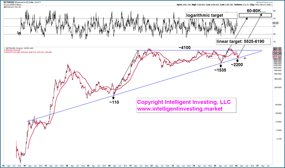 Thus, Ethereum remains in a long-term uptrend, as indicated by the lower, ascending dotted trendline. If ETH holds that sloping trendline, an immediate breakout above $4100 would target approximately $5525 on a linear scale: $1535+($4100-110). If Ethereum drops to ~$2200 support first and then breaks out, we can expect ~$6190.