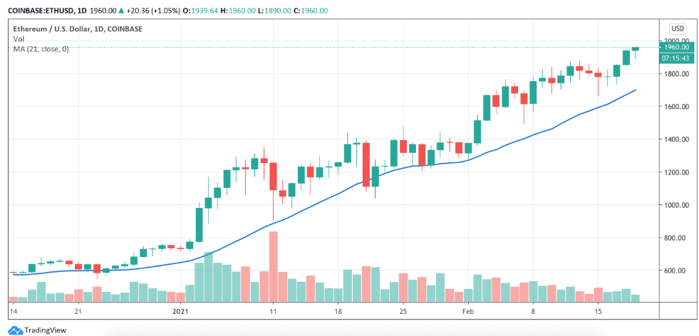 ETH seems to be moving more slowly than the rest of the market during this bull cycle. It’s knocking on the door of $2,000, but it’s had some trouble breaking above that level. The takeaway here is that ETH’s apparent “slow growth” is bullish: It continues to climb higher despite flows into other notable coins and DeFi tokens.
