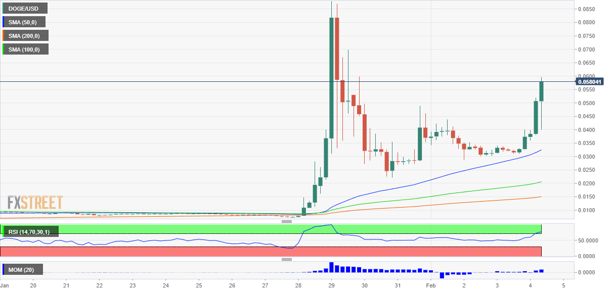 Dogecoin has surged by over 50%, with DOGEUSD hitting a high of $0.599 after Tesla's CEO Elon Musk tweeted that "Dogecoin is the people's crypto." The billionaire founder of Tesla and SpaceX also added an image of himself lifting Doge's Sheba dog toward the skies.
