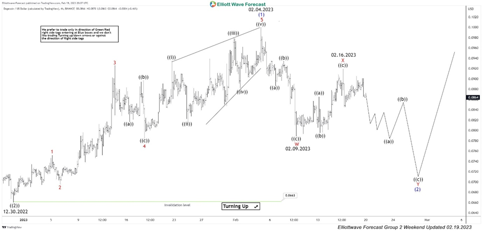 DOGE completed a cycle from 12.30.2022 low at 02.04.2023 peak and has been in a pull back since then. It made an initial decline in three waves which ended on 02.09.2023 low. This was followed by three waves bounce into a secondary peak on 02.16.2023 after which Dogecoin turned lower again. We called for the decline to resume for a new low below 02.09.2023 low to form a double three Elliott wave structure.