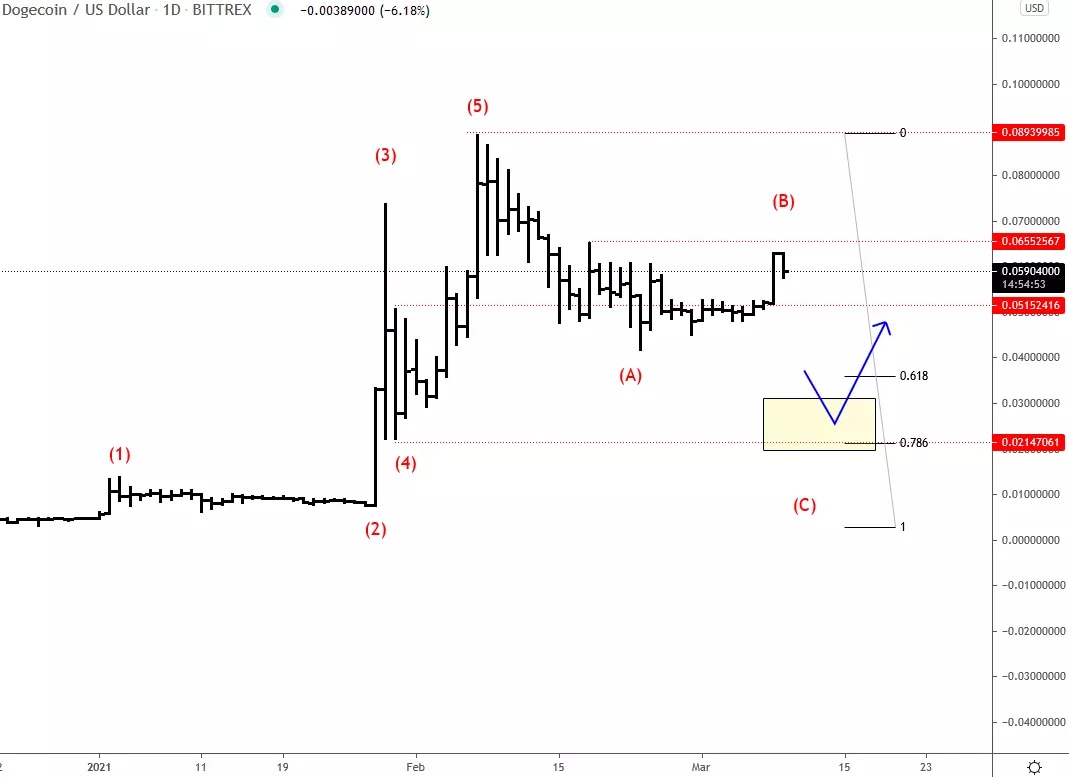 Today we will talk about DOGEUSD, its price action from technical point of view and wave structure from Elliott Wave perspective.DogeCoin has been very popular for the last couple of weeks, but looking at the bigger picture, we can see a completed five-wave cycle from the lows. And, if you are familiar with Elliott Waves, then you know that after every five waves, a three-wave A-B-C pullback follows, which according to the textbook pattern, usually retrace back to the previous wave (4) swing low.