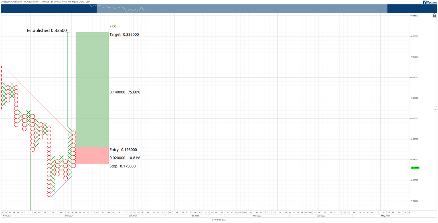 There is a phenomenal early entry opportunity now on the Dogecoin price Point and Figure chart. The theoretical long opportunity is a buy stop order at the 3-box reversal off the current column of Os, currently at $0.1950. A 4-box stop loss (currently at $0.175) and profit target at $0.335 complete the long setup. A 3-box trailing stop would help protect any implied profits post entry.