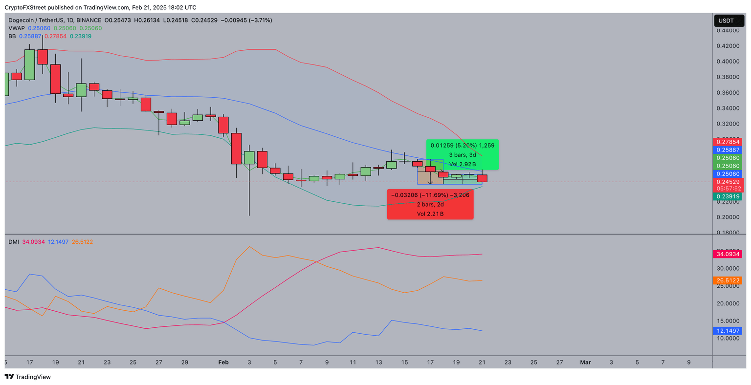 For upside continuation, DOGE must break past the upper Bollinger Band at $0.28. On the downside, failure to hold $0.24 could expose DOGE to deeper losses toward $0.22.