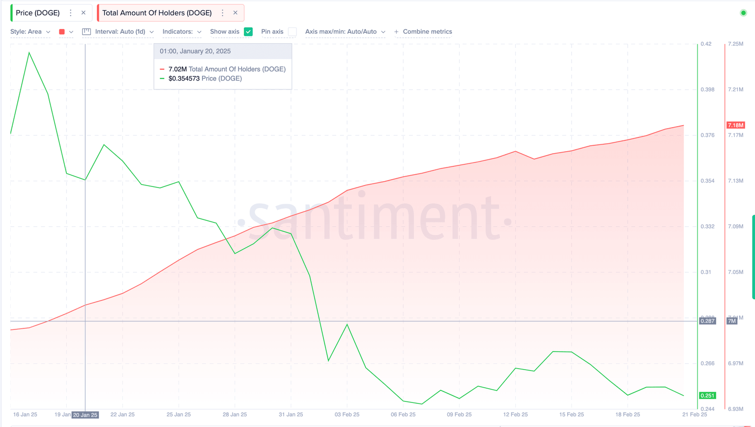 On January 20, the total number of wallets on the Dogecoin blockchain network was 7.02 million. As of this week, that figure has risen to 7.18 million, reflecting growing adoption in the aftermath of Musk’s official appointment to lead the DOGE oversight office.