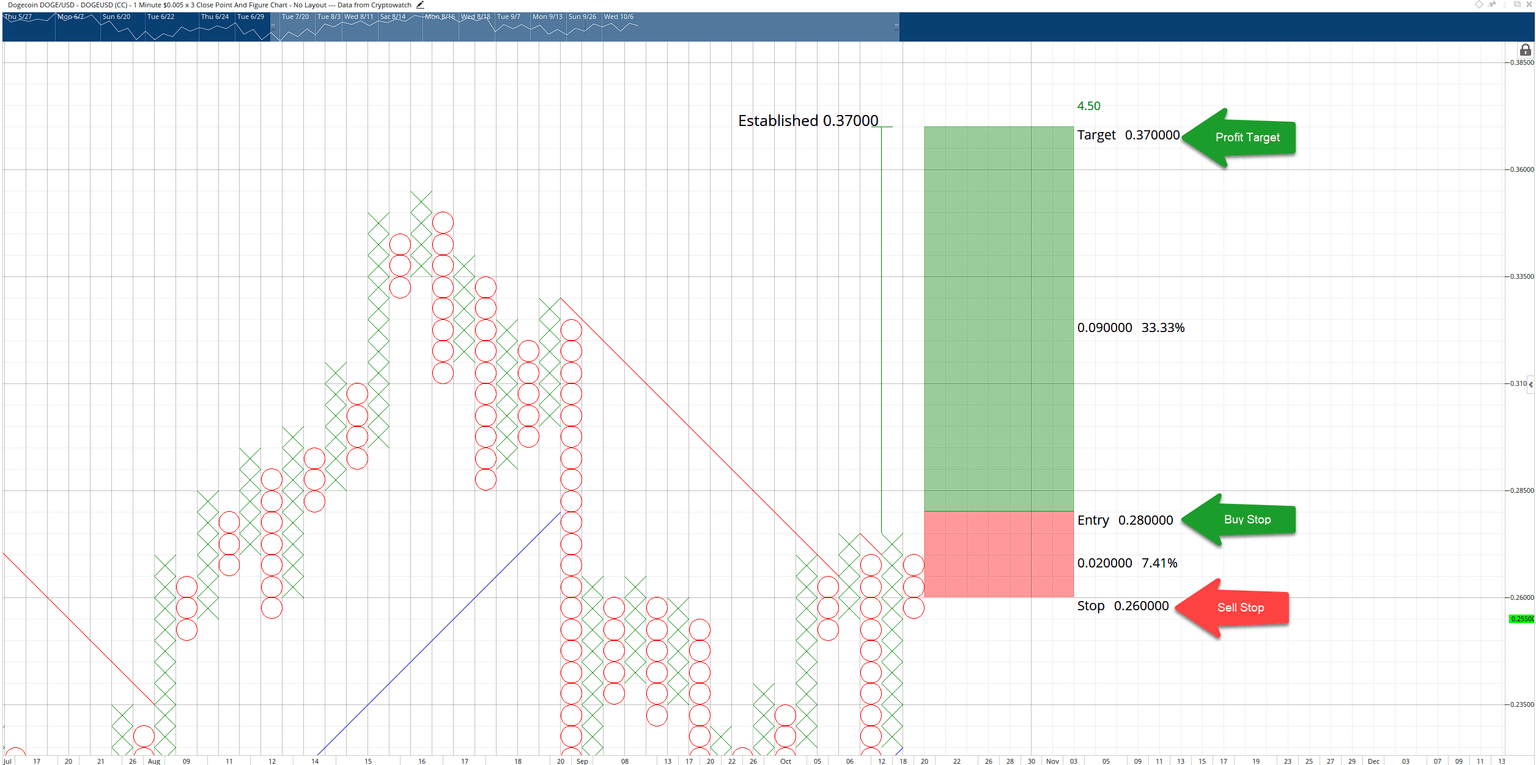 Dogecoin price has one of the most potent multi-top setups on its $0.005/3-box reversal Point and Figure chart: the triple top. The hypothetical trade setup is a buy stop order at $0.28 with a stop-loss order at $0.26. The vertical profit target method in Point and Figure analysis gives a hypothetical profit target at $0.37.