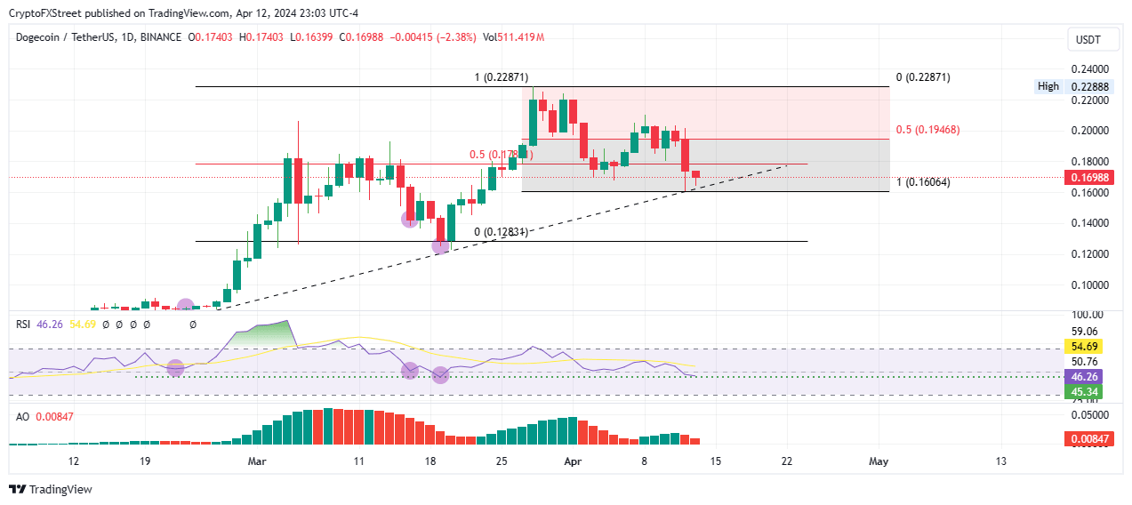 If the RSI holds above 45, the Dogecoin price recovery could ensue, with the Bitcoin of meme coins likely to retrace back to the 50% Fibonacci placeholder at $0.1946. This would constitute a 15% move above current levels. The Awesome Oscillator (AO) still holding in positive territory reinforces the above thesis.
