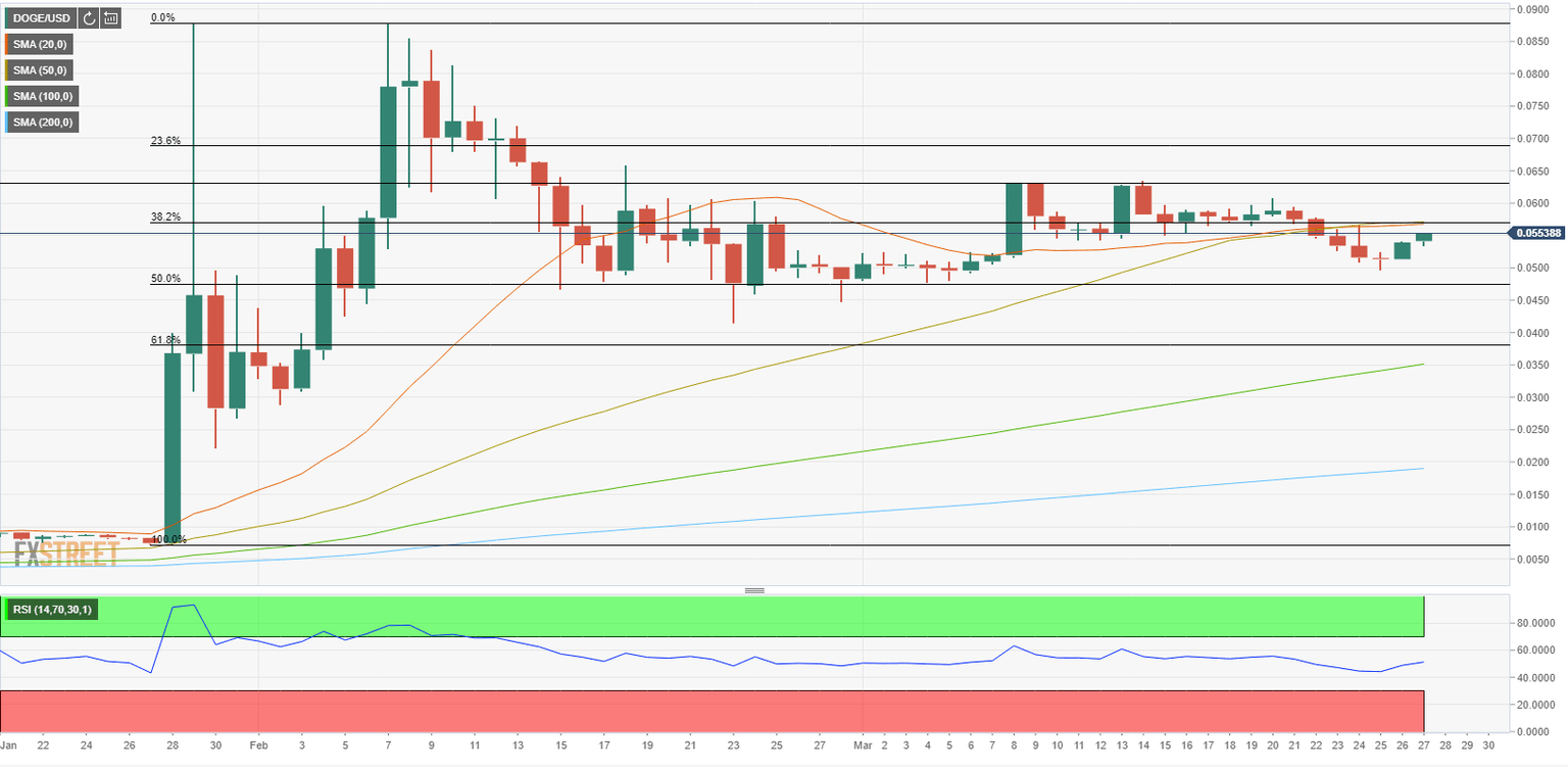 The 20-day SMA and the 50-day SMA are both located a little above the current price level at around $0.0570. Moreover, the Fibonacci 38.2% retracement of Jan. 28 - Feb. 7 upsurge is reinforcing that area as resistance. If Dogecoin manages to make a daily close above that hurdle, the door opens for additional gains toward $0.06630 (static resistance) and $0.06690 (Fibonacci 23.6% retracement).