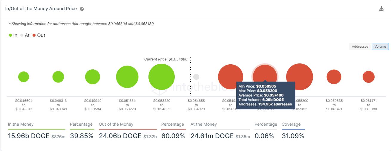 IntoTheBlock's In/Out of the Money Around Price (IOMAP) model shows that the price remains stuck between strong resistance and support areas. The significance of the $0.0570 hurdle is confirmed by the IOMAP, which shows that more than 6.2 billion DOGE had been acquired by nearly 135K addresses $0.05746.