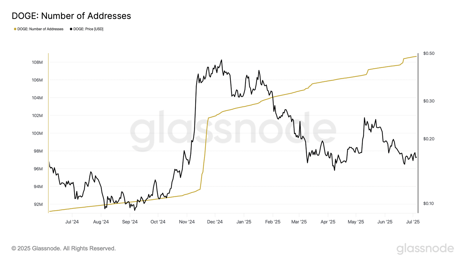The number of addresses on the Dogecoin network maintained a bullish outlook, reaching a new all-time high of approximately 108 million. According to Glassnode data, this growth represents a 5% increase from the January 4 level of around 103 million as of July 4.