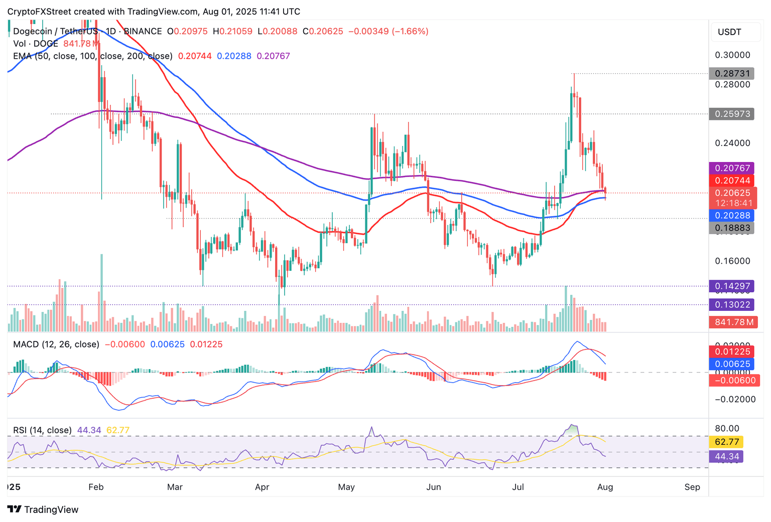 Dogecoin (DOGE) price recovery hangs in the balance, as bears tighten their grip on Friday. The largest meme coin by market capitalization has declined over 1% to $0.2062 at the time of writing, posting a fifth consecutive day of losses, as bulls struggle to put up a fight to prevent the decline from accelerating below $0.2000.
