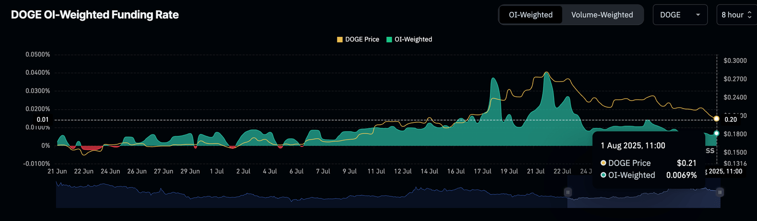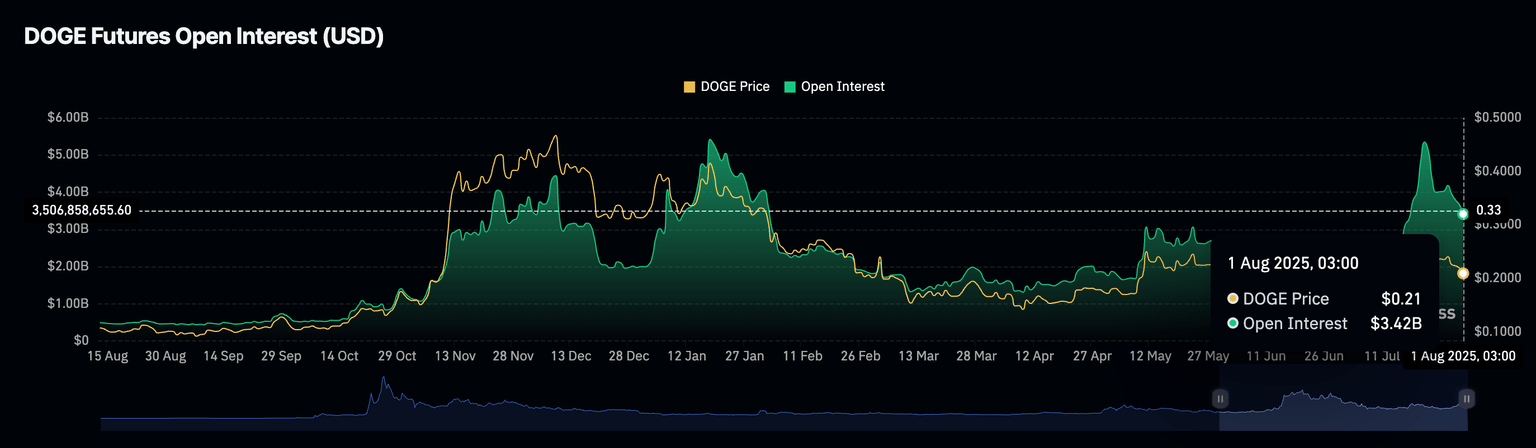 Interest in Dogecoin remains shaky on the first day of August, reflecting the risk-off sentiment in the broader cryptocurrency market. CoinGlass data highlights a significant decline in DOGE futures Open Interest (OI), by 36% to $3.42 billion, compared to its July peak of $5.35 billion.