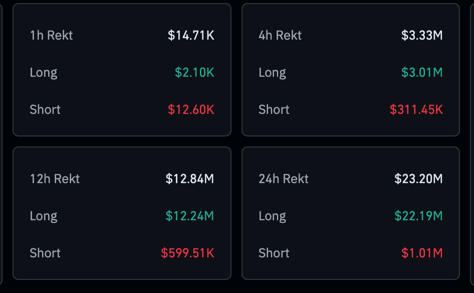Also notable is the surge in liquidations over the past 24 hours, averaging $23 million. Long position holders were hit hard, accounting for approximately $22 million of the total liquidations compared to around $1 million in shorts.