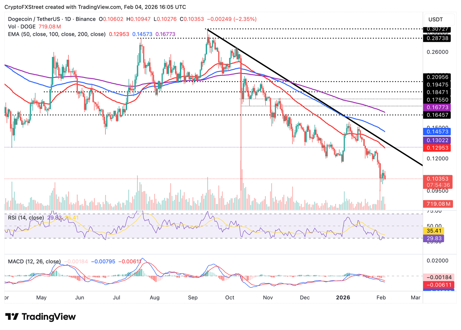 Dogecoin is edging lower toward $0.1000 support as the 50-day Exponential Moving Average (EMA) at $0.1295, the 100-day EMA at $0.1457 and the 200-day EMA at $0.1677 confirm a persistent bearish outlook.