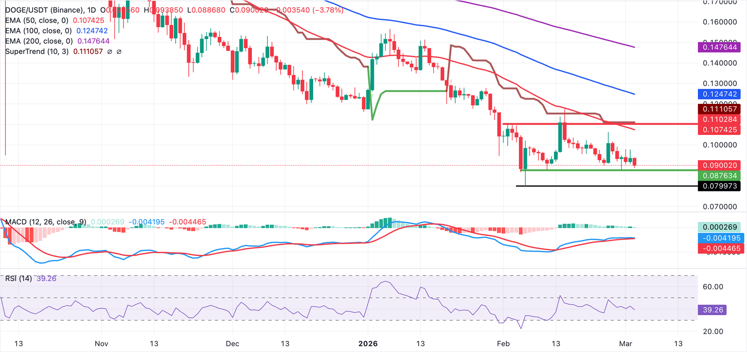 Dogecoin (DOGE) is trading around $0.090 at the time of writing on Tuesday, as risk-off sentiment grips the broader crypto market amid the ongoing war between the United States (US) and Iran.
