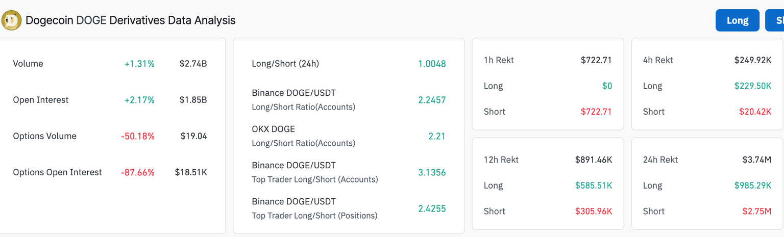 - Dogecoin on-chain metrics signal bullish potential as derivatives open interest rises 2.17% to $1.85 billion amid rising shorts liquidation.