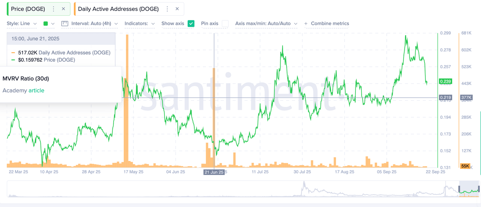 Additional on-chain data confirms the risk-off sentiment among whales, particularly with the number of active addresses averaging 55,000 as of September 22. This highlights significantly low network activity compared to approximately 517,000 daily active addresses in June. The increase in addresses transacting on the protocol in June preceded the steady rally in the price of DOGE to $0.2873 in July.