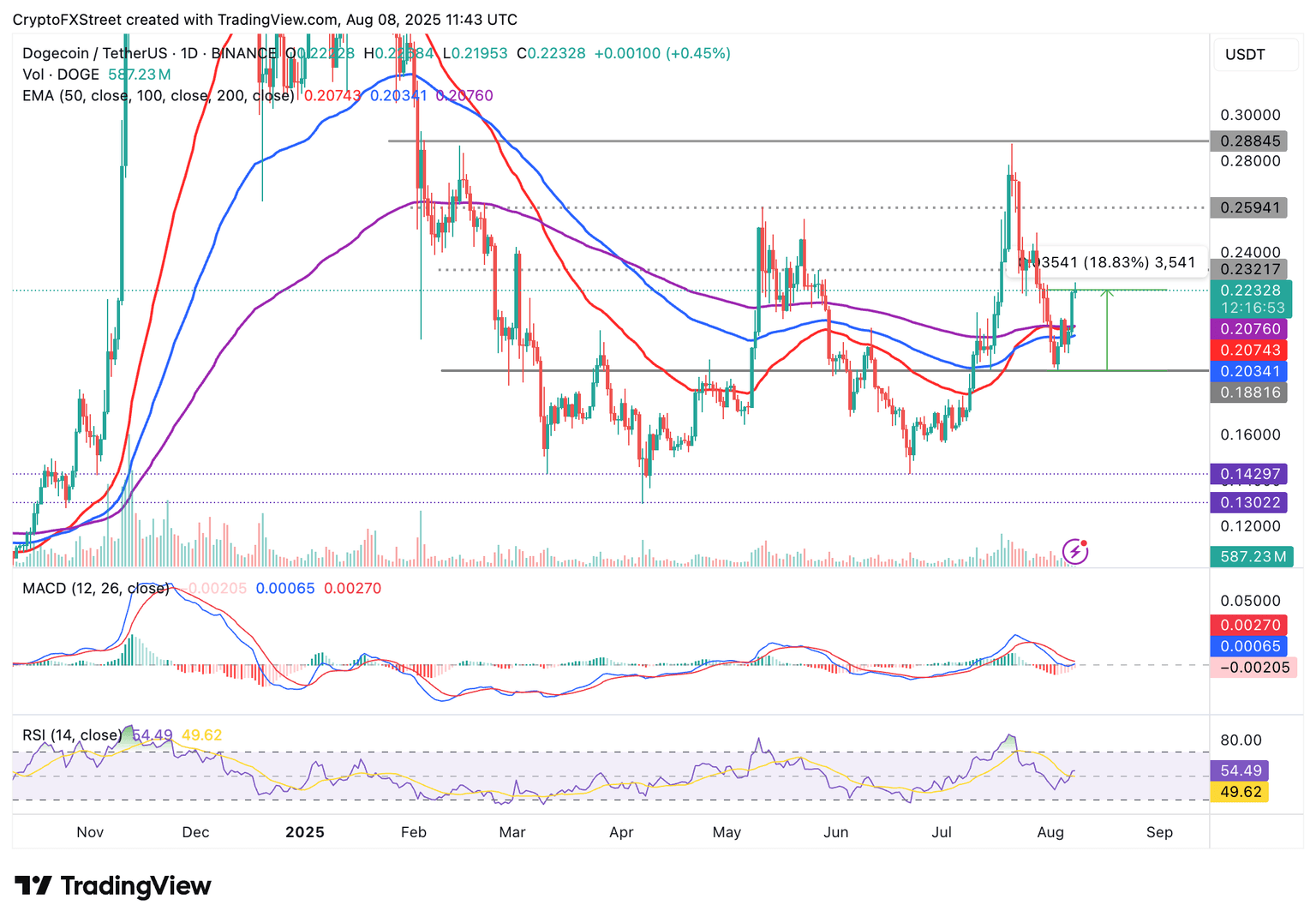 Dogecoin (DOGE) upholds a robust bullish outlook on Friday, as it extends recovery from support at $0.1881 by nearly 19% to trade at around $0.2232 at the time of writing.
