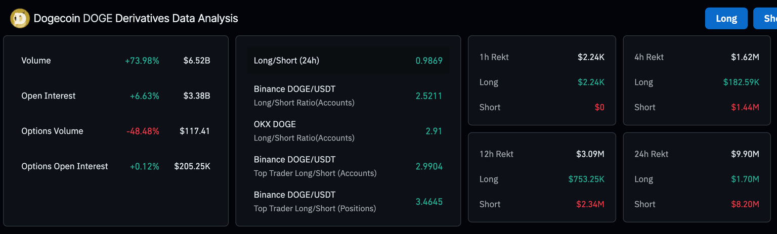 Interest in Dogecoin is expanding, according to CoinGlass derivatives market data. In the last 24 hours, Open Interest (OI), which refers to the notional value of outstanding futures or options contracts, has surged by 6.6% to $3.4 billion. A subsequent increase in the trading volume to $6.5 billion underscores the speculative demand and heightened market activity.