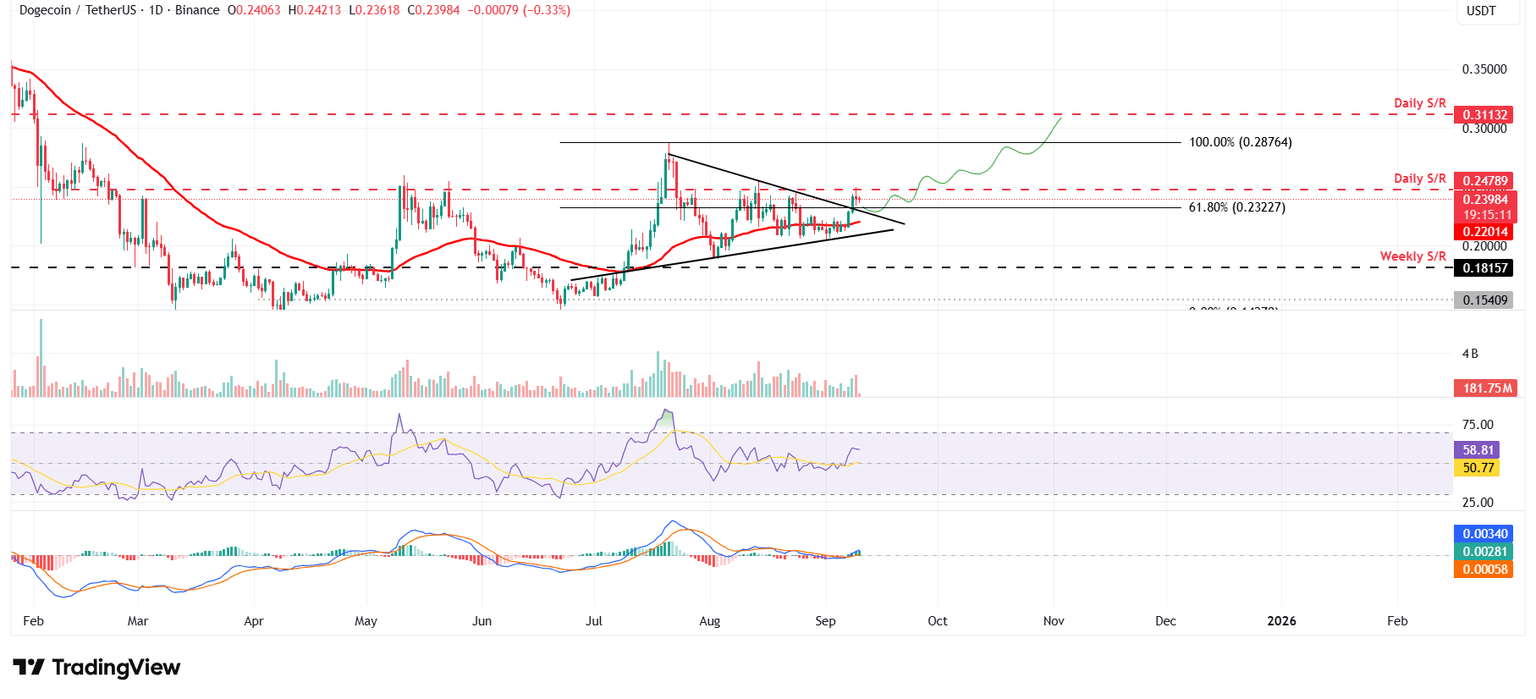 Dogecoin price broke above the symmetrical triangle pattern on Monday (formed by connecting multiple highs and lows with two trendlines since mid-July), favoring a bullish move ahead. However, on Tuesday, DOGE faced rejection from the daily resistance level at $0.247, and as of Wednesday, it hovers around $0.240.