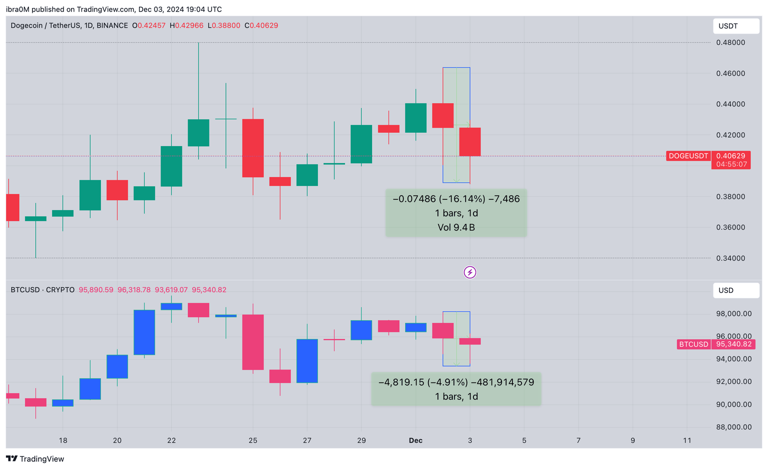 The chart above shows how Dogecoin mirrored Bitcoin’s 5% dip over the last 24 hours.