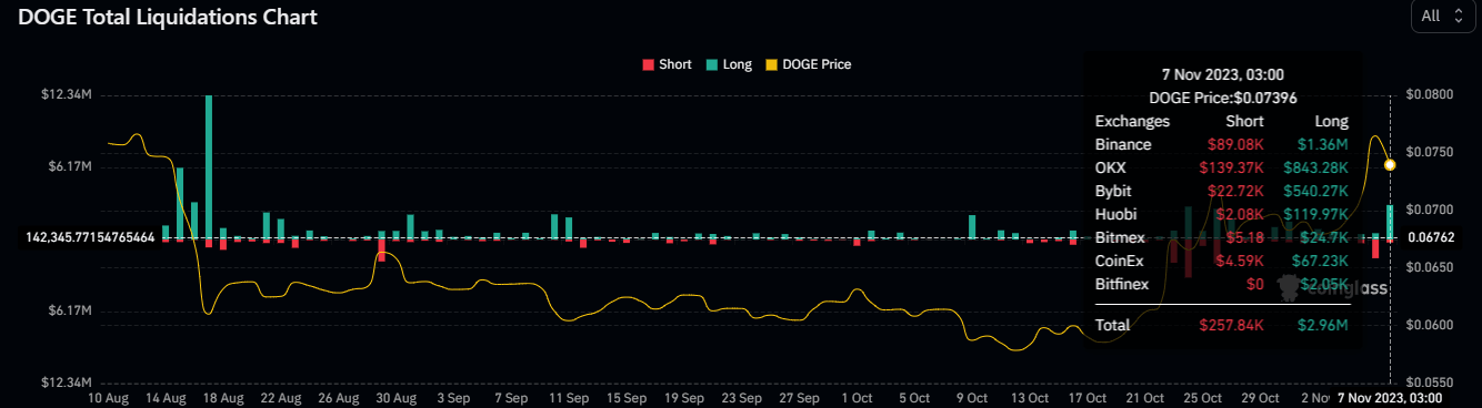 Dogecoin (DOGE) price is up almost 30% since the crypto market turned bullish, recording a sustained uptrend before a consolidation phase. Now an uptrend is on course again. Nevertheless, the cryptocurrency faces a supply barrier extending from $0.076 to $0.080. This region sent the altcoin down almost 7%, liquidating up to $2.96 million worth of long positions.