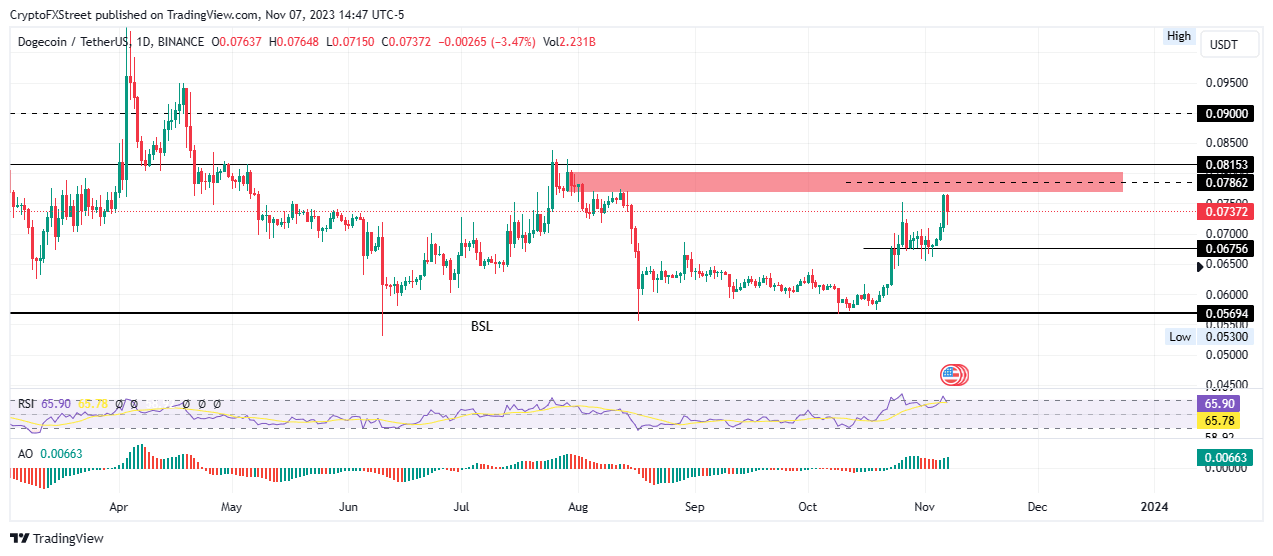 The Awesome Oscillator (AO) indicator is in positive territory with green histogram bars to show bulls are leading the market. The position of the Relative Strength Index (RSI) is also motivating, holding just below 70 to give bulls time to gather strength after exhaustion since DOGE was recently overbought.