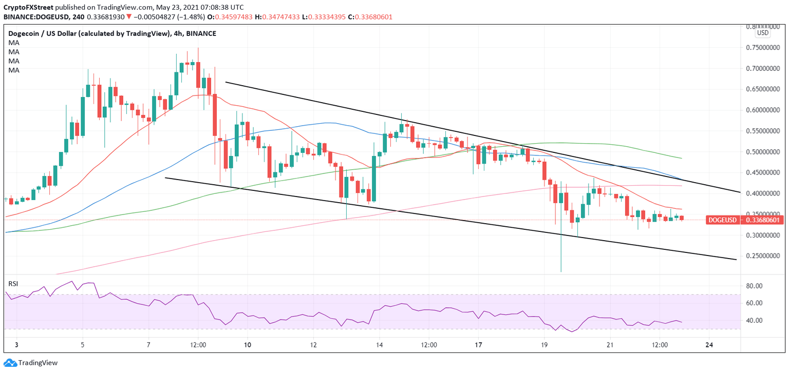 Dogecoin’s four-hour chart shows that the price is in a consolidative mode below the critical short-term 21-simple moving average (SMA) at $0.3623.
