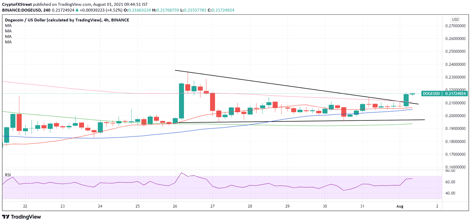DOGE price has gained about 5% in the past four hours, as it hovers around $0.2150, having witnessed two straight weekly rise.