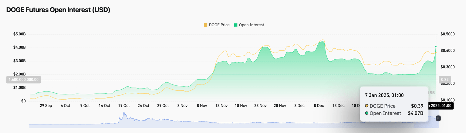 Dogecoin open interest grew from $2.89 billion on Sunday to $4.07 at the time of writing on Tuesday.