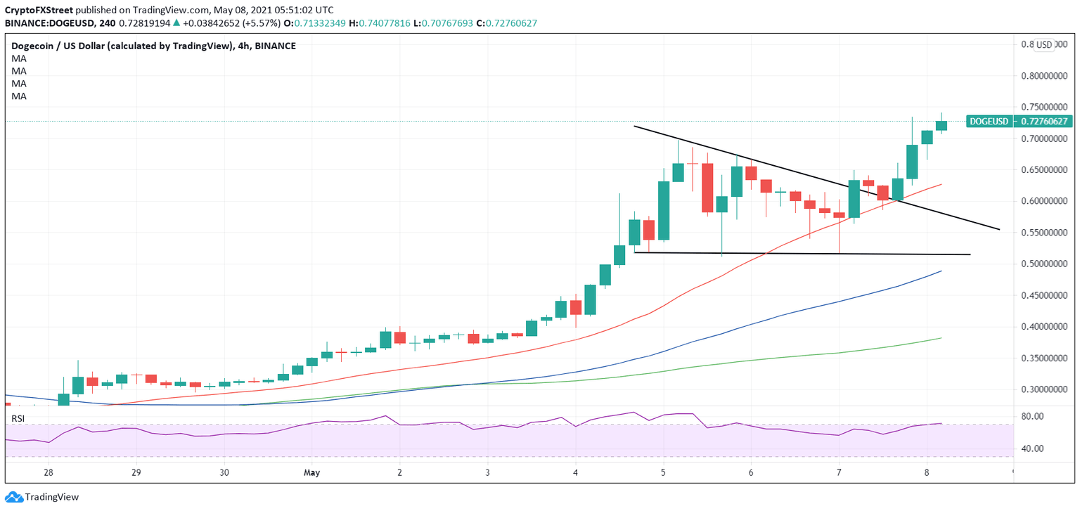 Having confirmed a descending triangle breakout on the four-hour chart in Friday’s Asian trading, DOGE/USD built onto the upside, looking to retest the record highs.