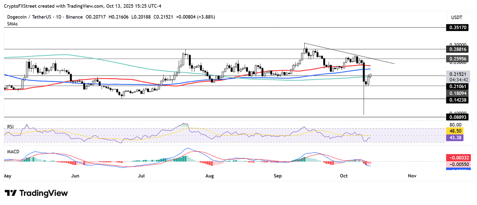 After the crypto market flash crash on Friday, DOGE found support at $0.180 before staging a recovery above the $0.210 level, which is strengthened by the 200-day Simple Moving Average (SMA).