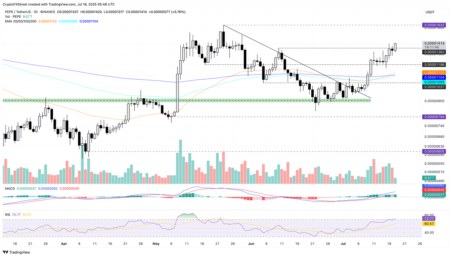 Pepe exceeds the $0.00001362 level marked by the June 10 high, extending the triangle breakout rally on the daily chart. A decisive close above this level, unlike the bullish failure on Wednesday, could extend the uptrend to the May 23 high of $0.00001632.