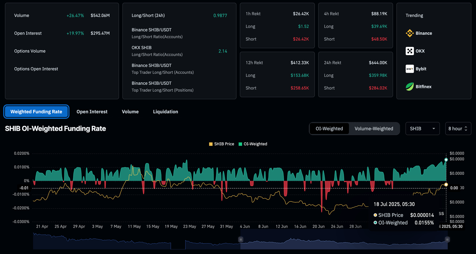 CoinGlass data shows a near 20% surge in SHIB OI over the last 24 hours, reaching a six-month high of $295.47 million. Adding credence to increased buying, the OI-weighted funding rate is at 0.0155%, up from 0.0110% on Thursday.
