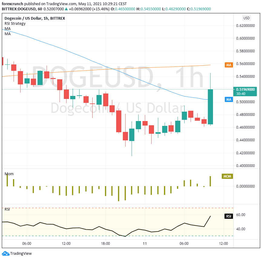 Dogecoin (DOGE/.USD) has jumped by around 20% to $0.54 in a swift move Elon Musk, founder of Tesla and SpaceX tweeted a poll asking if his company should accept this cryptocurrency as a means of payment. It seems to have ended its consolidation.