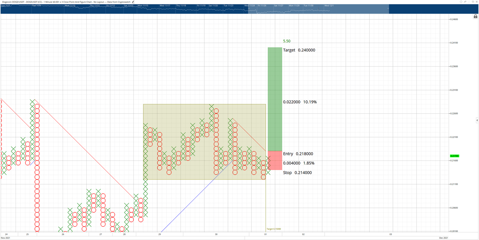 Despite the bullish positioning for Dogecoin, there is a possibility of a powerful short setup that would invalidate the above theoretical long entry. Dogecoin does have a split-triple bottom pattern on its chart. The hypothetical short entry is a sell stop order at $0.212, a stop loss at $0.217 and a profit target at $0.153. The profit target is derived from the Horizontal Profit Target Method in Point and Figure Analysis.