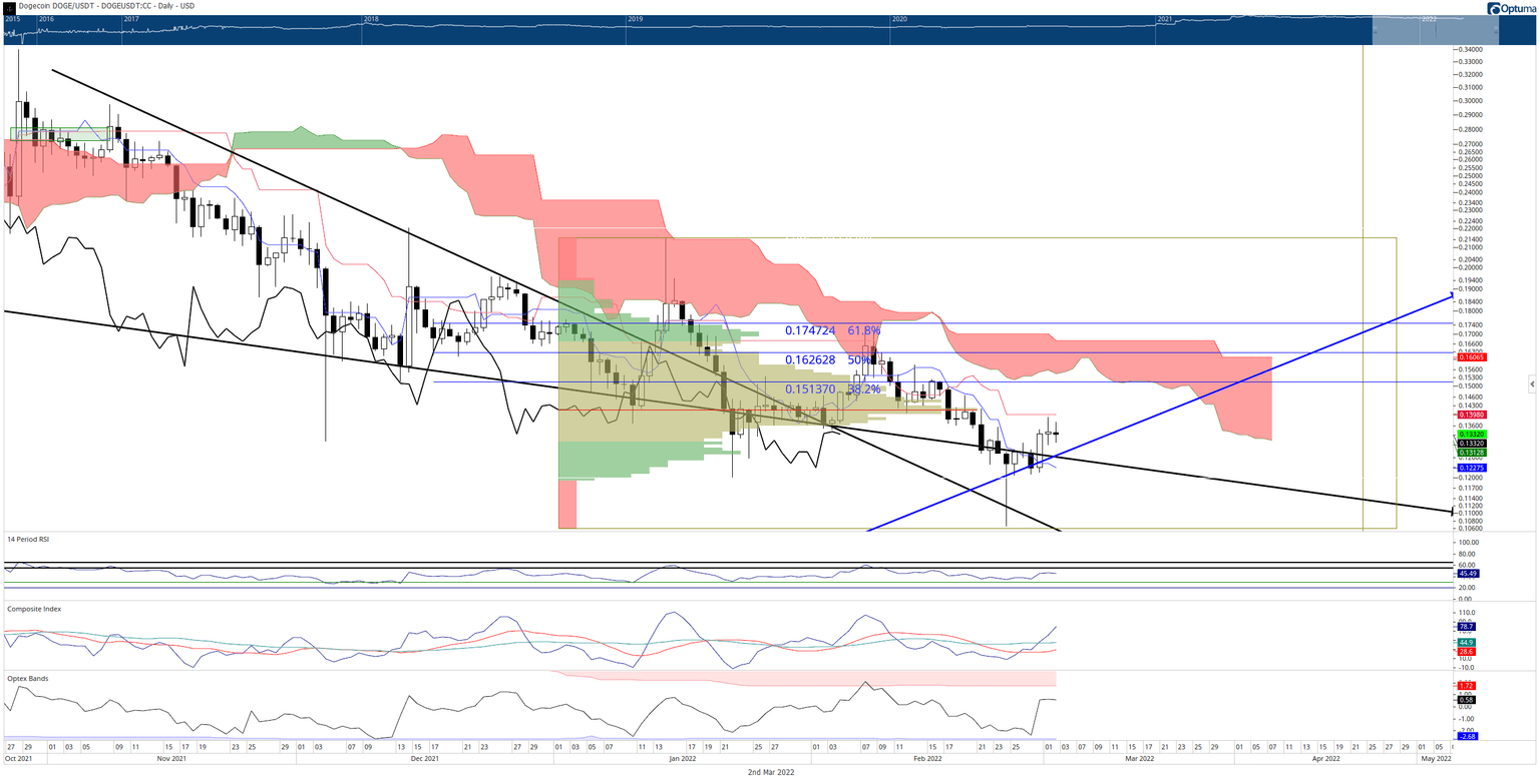 Dogecoin price is at an inflection point for bulls. The $0.14 price contains the 23.6% Fibonacci retracement, the 2022 Volume Point Of Control, and the daily Kijun-Sen. In addition, $0.14 represents the closest and strongest resistance level on the daily chart for DOGE.