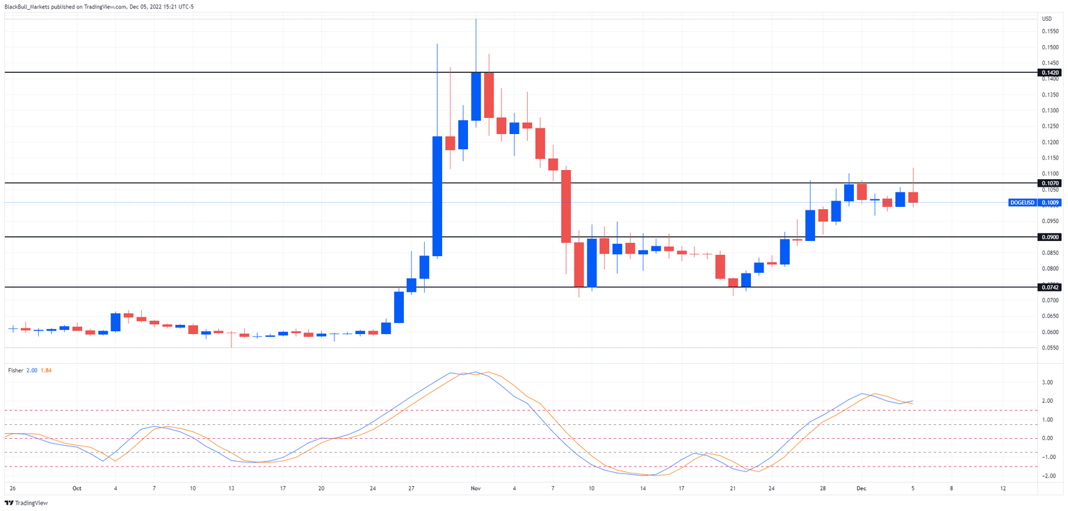 Looking at the current price action at the start of the week, DOGE may be in a new area of consolidation and trying to break the resistance at 0.1070. Looking back at the Fisher Transform, we can see that it is again indicating a crossover signal, which may hint that DOGE is posed for an upside breakout. If the price successfully breaks the resistance at 0.1070 and manages to close above the daily chart, the next price target to watch includes 0.1420 if the momentum is strong enough.