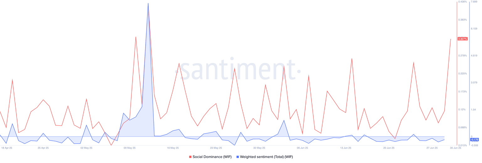 Santiment’s social dominance score for Dogwifhat reaches 0.327%, a new high since mid-May, indicating an increase in social chatter around WIF. The metric relates to the percentage share of media discussions of Dogwifhat.