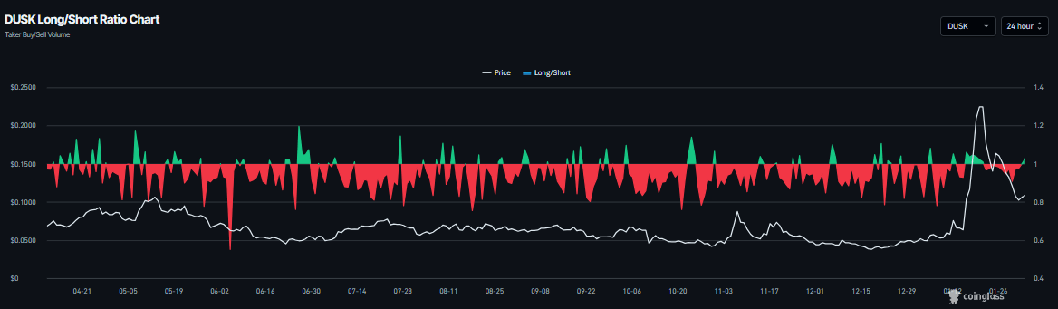 CoinGlass data show that DUSK's long-to-short ratio reads 1.02 on Tuesday and has been steadily rising. The ratio above one reflects bullish sentiment in the markets, as more traders are betting on the asset price to rally.