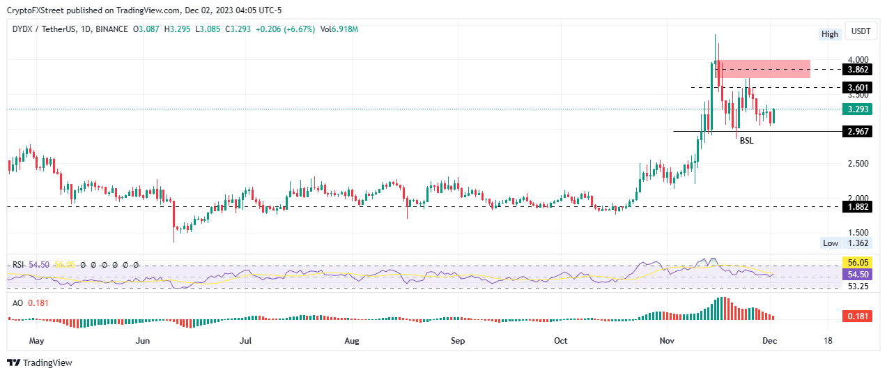 Traders heeding this call could extend the uptrend for dYdX price, potentially catapulting it past the $3.601 resistance level. In a highly bullish case, it could extrapolate into the supply zone extending from $3.722 to $4.003. To confirm the continuation of the uptrend, however, DYDX market value must overcome the mean threshold at $3.862.