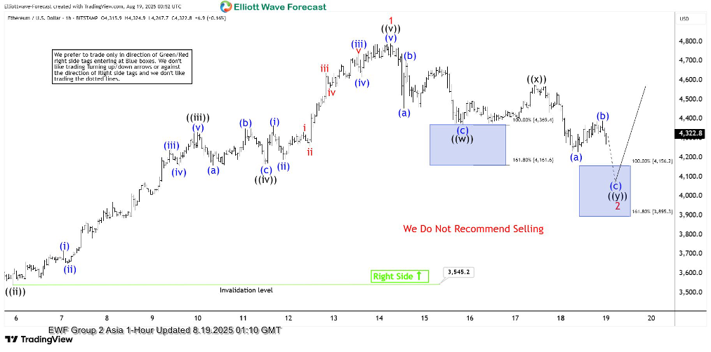 Currently, a corrective wave 2 is unfolding as a double three Elliott Wave structure. From the wave 1 peak, wave (a) declined to $4,455, and wave (b) rallied to $4,706.4. Ethereum then dropped in wave (c) to $4,370.9, completing wave ((w)) in a higher degree. A subsequent rally in wave ((x)) peaked at $4,578.1. From there, wave (a) fell to $4,228.8, and wave (b) climbed to $4,390. The ongoing wave (c) of ((y)) is expected to push Ethereum lower, targeting the $3,895–$4,156.2 range, which aligns with the 100%–161.8% Fibonacci extension of wave ((w)). From this zone, Ethereum could resume its upward trend or stage at least a three-wave bounce, signaling potential bullish continuation.