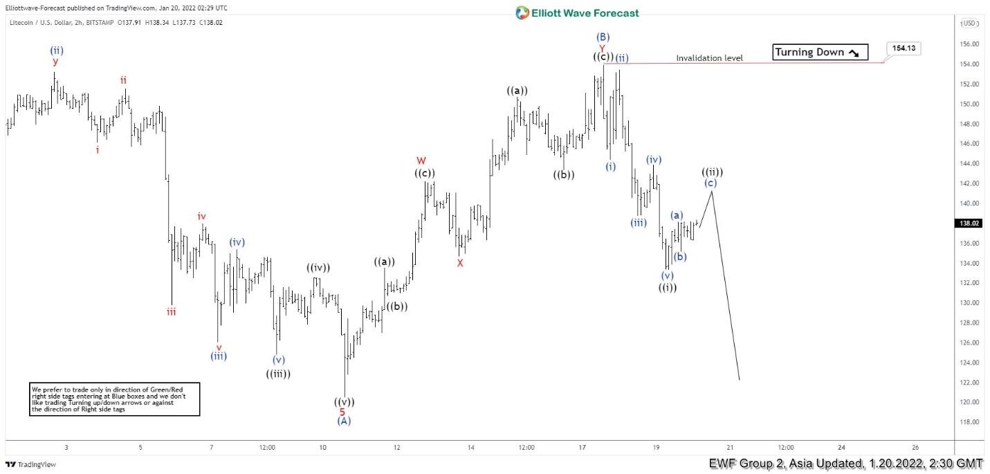 Short Term Elliott Wave view in Litecoin (LTCUSD) suggests decline from November 10, 2021 high is unfolding as a zigzag Elliott Wave structure. Down from November 10, 2021 high, wave (A) ended at 120.49 as the 2 hour chart below shows. Wave (B) bounce ended at 154.13 with internal subdivision as a double three Elliott Wave structure. Up from wave (A), wave ((a)) ended at 133.49, wave ((b)) dips ended at 130.71, and wave ((c)) ended at 142.22. This completed wave W in higher degree. Pullback in wave X ended at 134.65. The crypto currency then extended higher in wave Y with subdivision as a zigzag in lesser degree. Up from wave X, wave ((a)) ended at 150.70, wave ((b)) ended at 143.35, and wave ((c)) ended at 154.13. This completed wave Y and also wave (B) in higher degree.