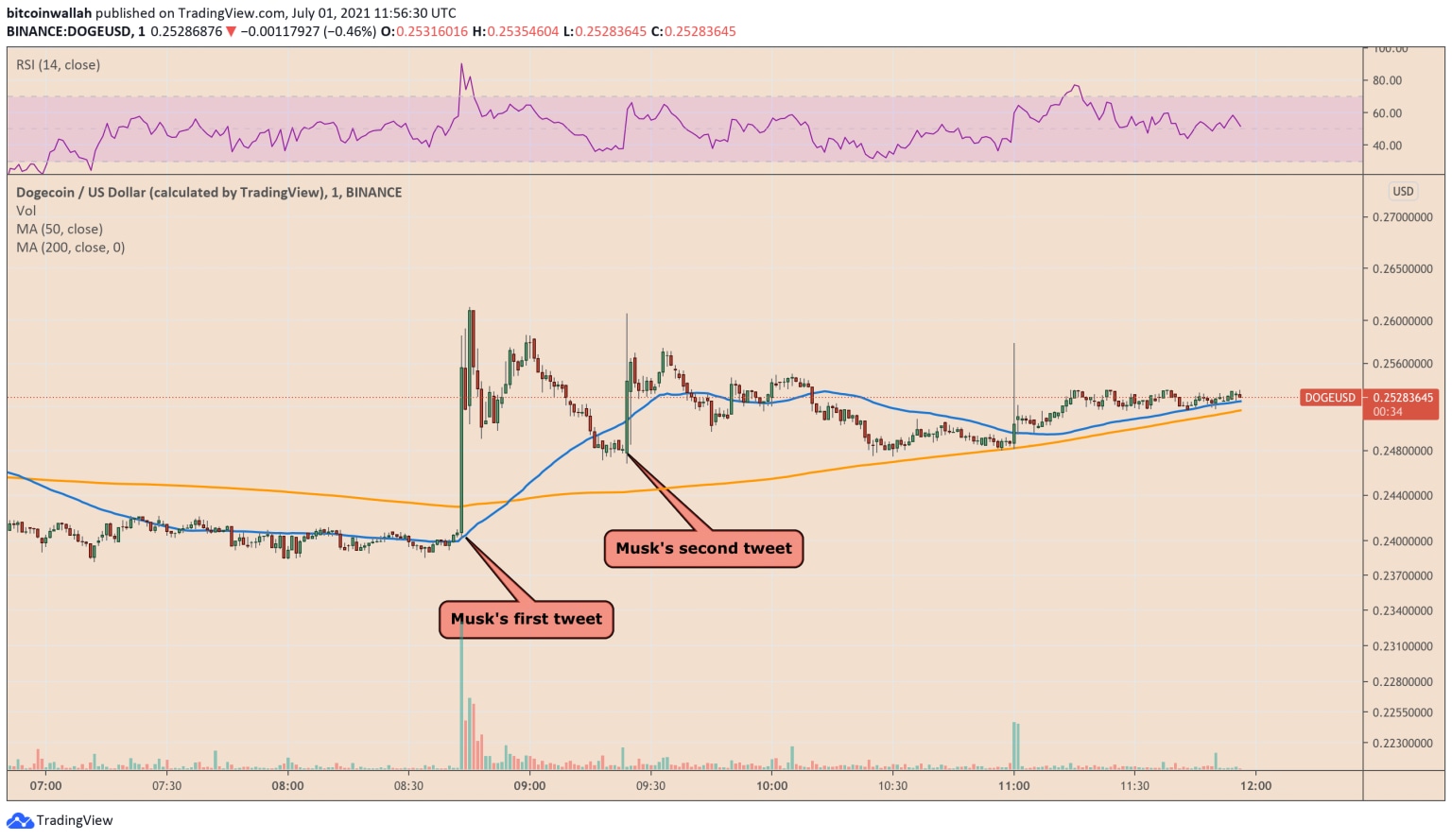 DOGE/USD rose 5.22% to $0.260 after the second tweet.