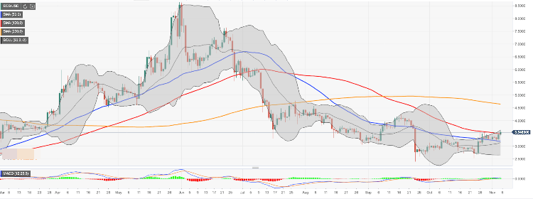On a daily chart, EOS/USD broke above SMA100 (Simple Moving Average) at $3.48, which is a positive signal for the bulls. The coin bottomed at $2.53 on October 23 and has been moving in a range limited by $3.15-$3.50. The next resistance is created by the upper line of the Bollinger Band on a daily chart at $3.64. Once it is out of the way, the upside is likely to gain traction with the next focus on psychological $4.00 and September 17 high at $4.24.