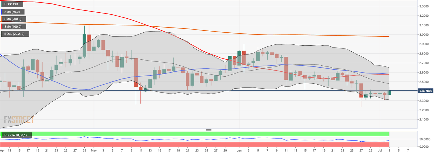 On the intraday chart, EOS/USD broke free from the recent consolidation channel and settled above 1-hour SMA200 at $2.40. While this is a positive signal, we will need to see a confirmation in the form of the daily close above this barrier. The next local resistance is created by $2.50 with the middle line of the daily Bollinger Band located on approach. Also, this line served as a support during the consolidation period in the middle of June. Once it is out of the way, the upside is likely to gain traction with the next focus on a combination of the daily SMA50 and SMA100 at $2.58. This resistance may slow down the recovery as it capped the upside back in June.