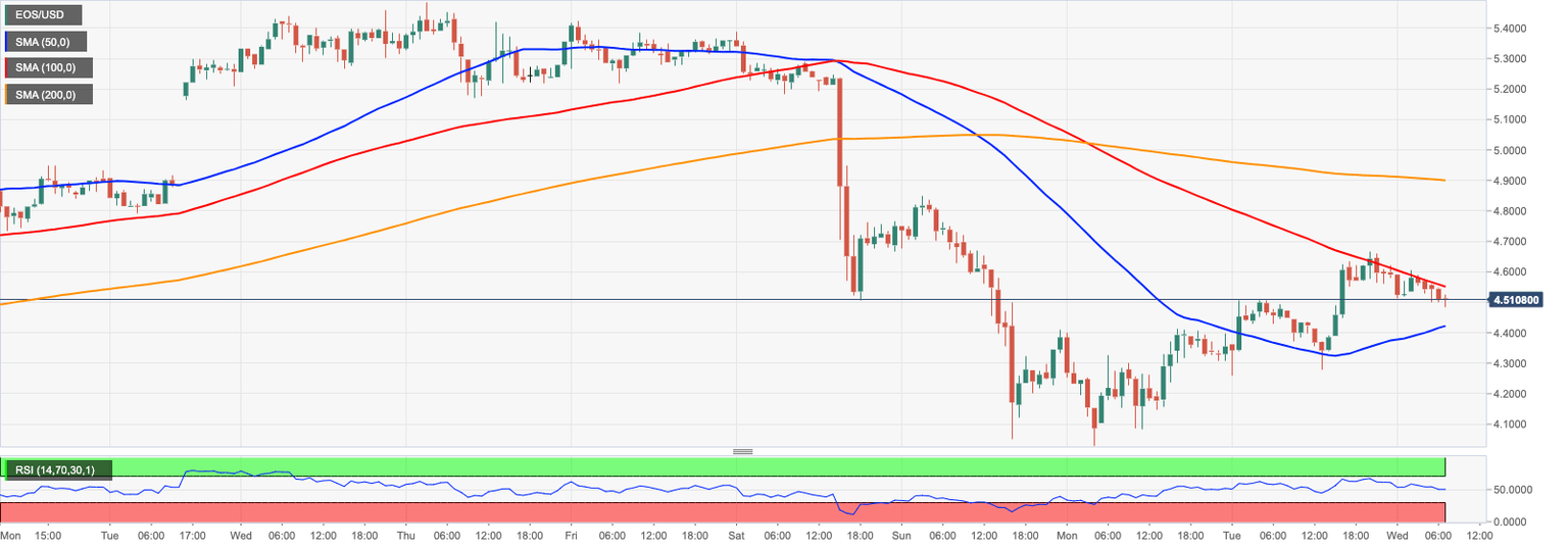 - EOS/USD needs to break above $4.55 for the recovery to gain traction.