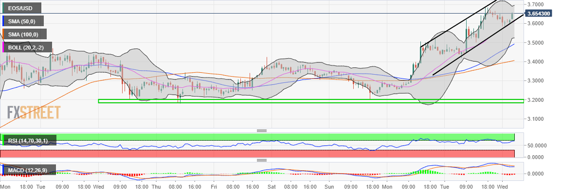 The one-hour chart clearly shows EOS in an upward trend within an ascending channel. The range between $3.6 and $3.7 is considered a bullish zone. Likely consolidation in the range is likely to result in a breakout above $4.0 in the coming sessions. Besides, the constricting levels of the Bollinger Bands suggests that a breakout is in the offing.