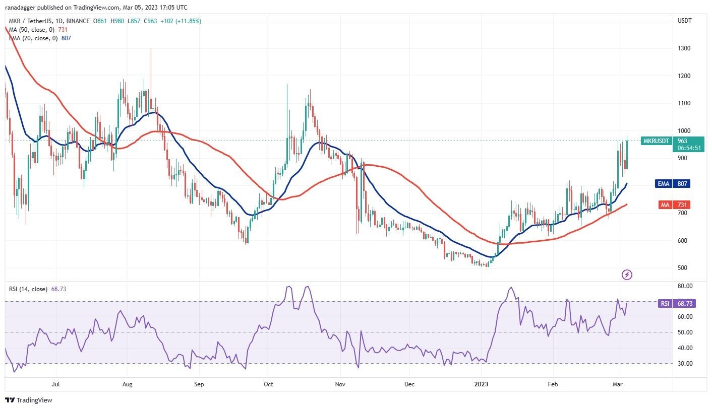ImmutableX (IMX) rebounded off the 50-day SMA ($0.88) on March 3 and closed above the 20-day EMA ($1), indicating solid demand at lower levels.