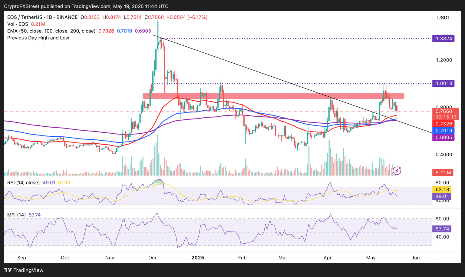 EOS price slides on Monday to approximately $0.75, erasing a minor uptick on Sunday, while extending the drawdown from the May 10 high at around $0.99. The EOS network rebranded to Vaulta in the first quarter, paving the way for a web3 banking platform. Investors and cryptocurrency exchanges are preparing for the token swap from EOS to Vaulta (A), which is expected to start on May 26.