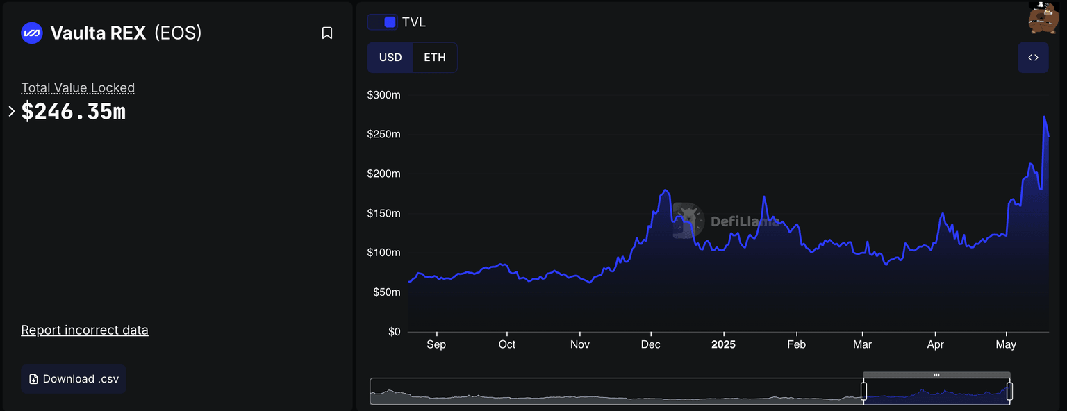 - EOS’s rebranded Vaulta’s DeFi TVL volume reached $273 million on Saturday before correcting to $246 million.